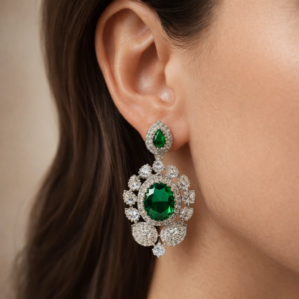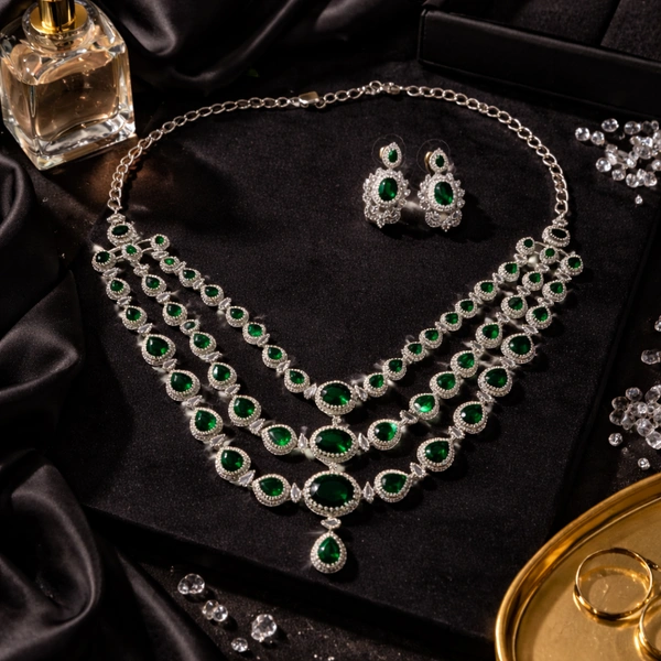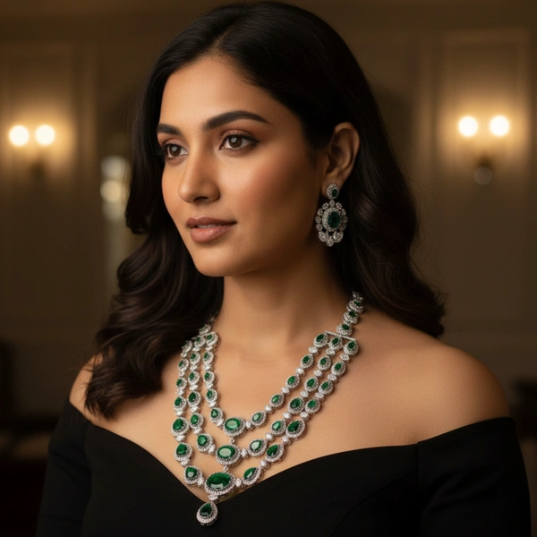 A regal American diamond and emerald-look necklace with matching earrings, crafted for royalty - designed to command attention at weddings, and shine effortlessly on Oscar-worthy nights.