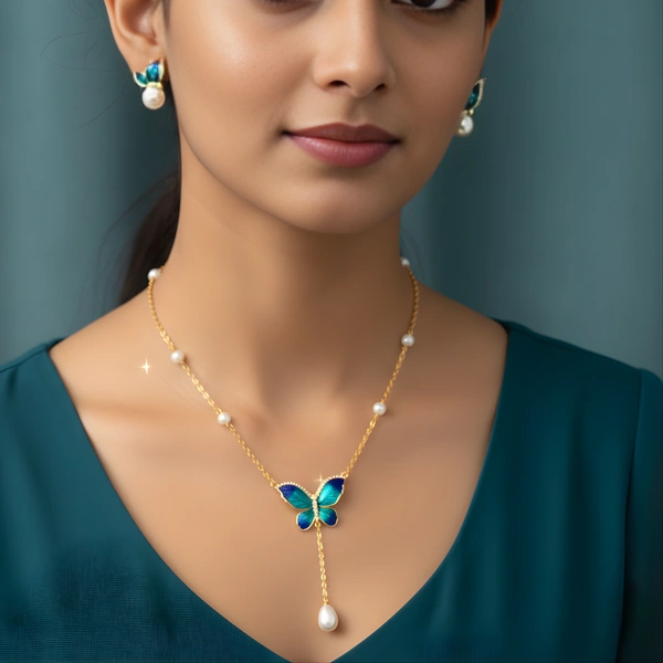 Celebrate transformation with this srtiking butterfly set,showcasing deep indigo enamel and sparkling accents.The elegant gold toned chain and dangling pearl finish create a perfect look for everyday styling.