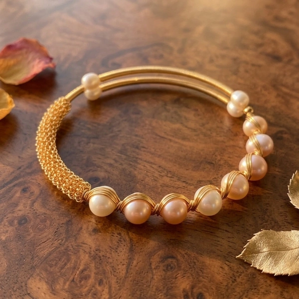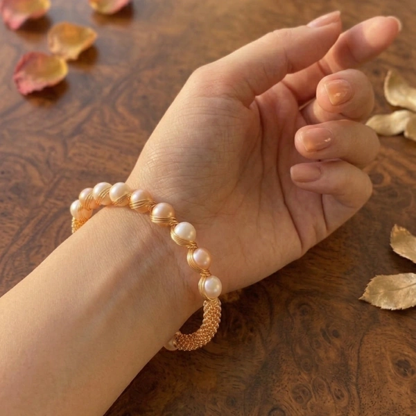 Add a touch of handcrafted charm to your wrist with this modern, artisanal wire-wrapped bracelet. Featuring a delicate mix of ivory and subtle blush pearls secured along a textured gold-toned base, it serves as a beautiful contemporary statement piece.