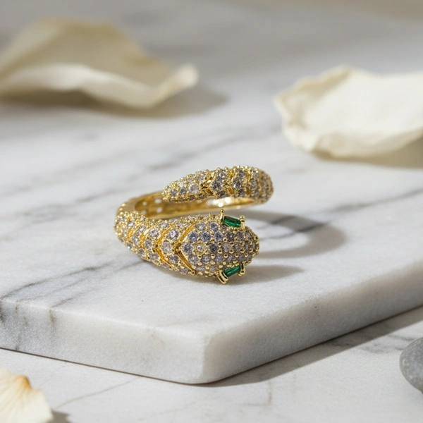 Make a bold, edgy statement with this adjustable serpent wrap ring, designed to coil elegantly around your finger. Encrusted with brilliant-cut micro-crystals and featuring striking green stone eyes, this piece brings a touch of fierce luxury to any look.