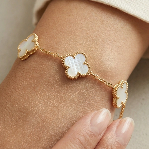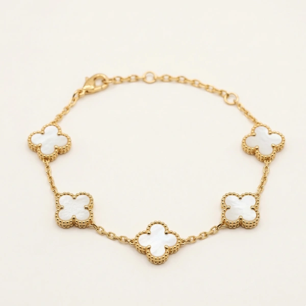 Embrace the charm of the iconic four-leaf clover with this exquisitely crafted beaded-edge bracelet. Designed with five delicate motifs on a shimmering gold-tone chain, it’s the ultimate symbol of luck and sophisticated grace for any occasion.