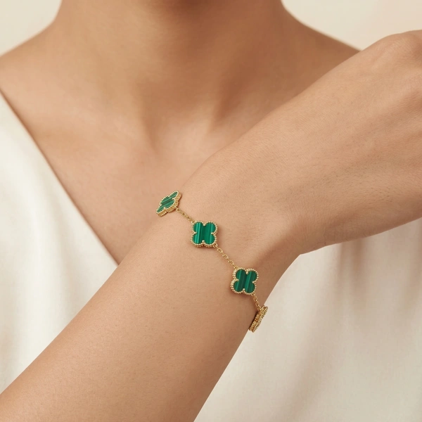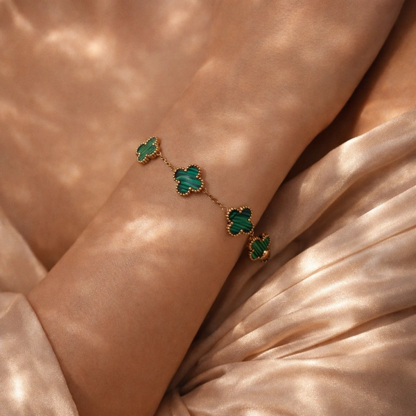 Embrace the charm of the iconic four-leaf clover with this exquisitely crafted beaded-edge bracelet. Designed with five delicate motifs on a shimmering gold-tone chain, it’s the ultimate symbol of luck and sophisticated grace for any occasion.