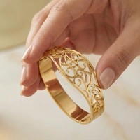 An exquisite wide-band bracelet featuring laser-cut floral and scrollwork motifs. Its airy, open-frame design balances boldness with femininity, making it a standout statement piece.