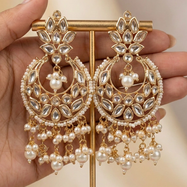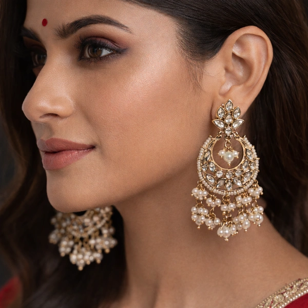 Channel timeless royalty with these exquisite gold-toned Chandbalis, intricately set with shimmering Kundan stones and delicate pearl clusters. Perfect for making a regal statement at weddings or festive celebrations.
