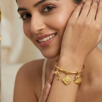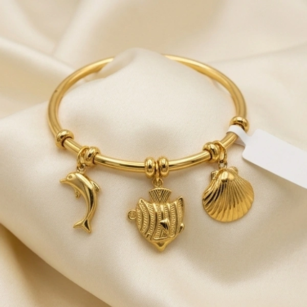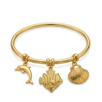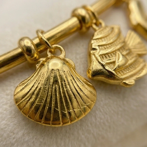 Celebrate the spirit of the sea with this delicate gold-toned bangle adorned with intricately detailed fish and dolphin charms.