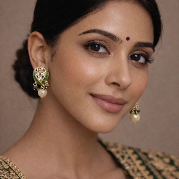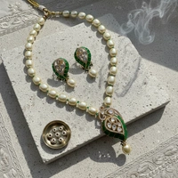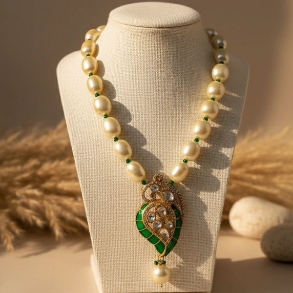 A stunning fusion of heritage and color, this necklace features oversized baroque pearls paired with a central Kundan and emerald-green pendant. It is the ultimate accessory for traditional bridal or festive wear.