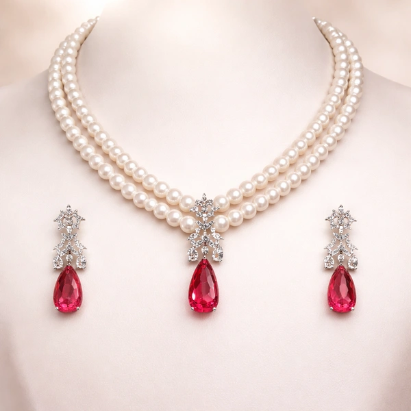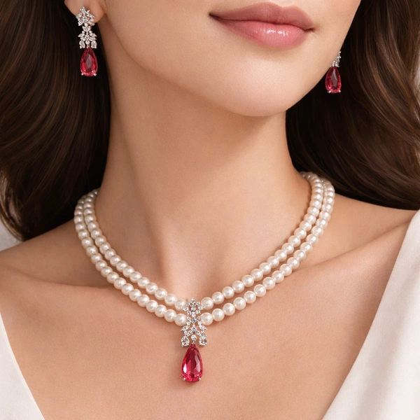 Exude effortless grace with this double-strand pearl necklace, punctuated by a radiant pear-cut ruby-colored pendant. The intricate floral crystal setting adds a touch of sparkle, making it the perfect choice for weddings, anniversaries, or romantic dinners.