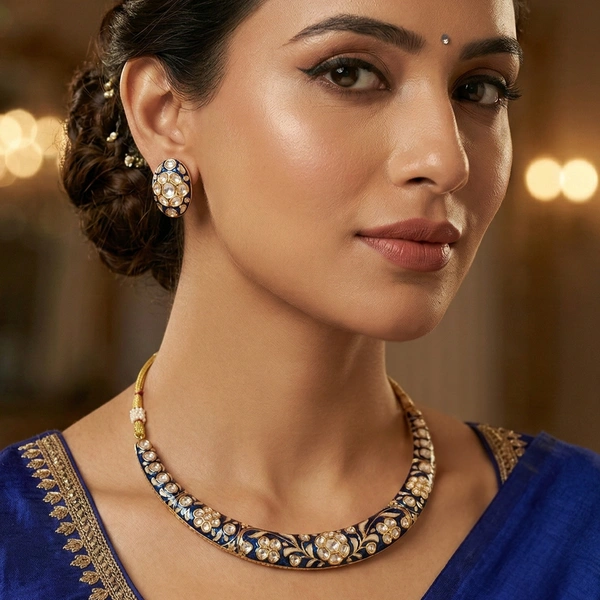 Rediscover traditional elegance with this masterfully crafted crescent-shaped Hasli. This set features deep indigo blue enamel work (Meenakari) adorned with intricate floral motifs and shimmering polki-style stones. The clean, sophisticated finish makes it a perfect statement piece for festive gatherings, blending heritage artistry with a modern silhouette.