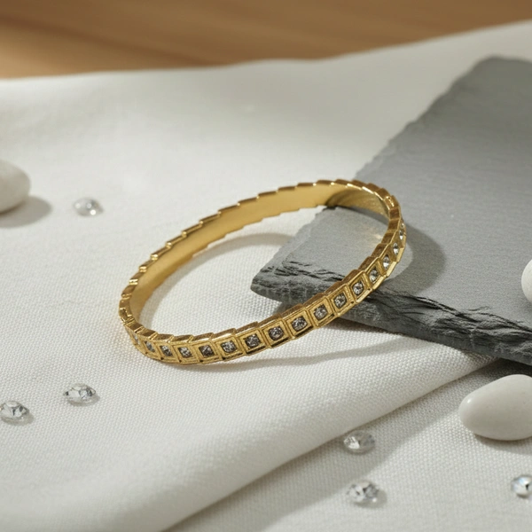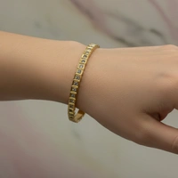 This bracelet features a continuous row of shimmering stones, each individually set within a bold square bezel. Its structured design provides a sophisticated, high-impact look for both day and evening wear.