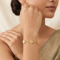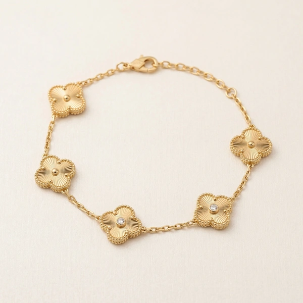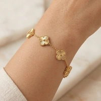 Embrace the charm of the iconic four-leaf clover with this exquisitely crafted beaded-edge bracelet. Designed with five delicate motifs on a shimmering gold-tone chain, it’s the ultimate symbol of luck and sophisticated grace for any occasion.