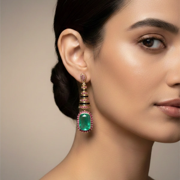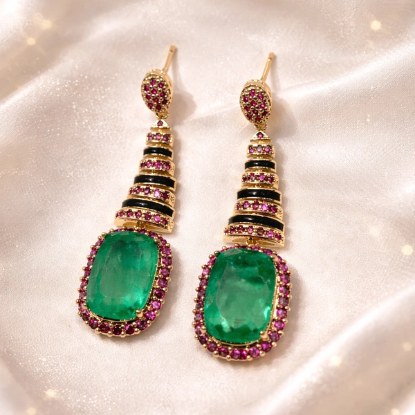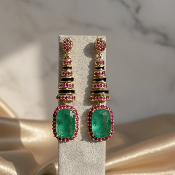 A masterclass in bold geometry, these striking earrings feature tiered black enamel pillars accented by vibrant pink halos and a regal emerald-cut center stone. Designed for the woman who isn't afraid to be noticed, they bring vintage architectural glamour to the modern era.