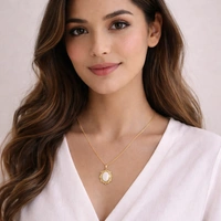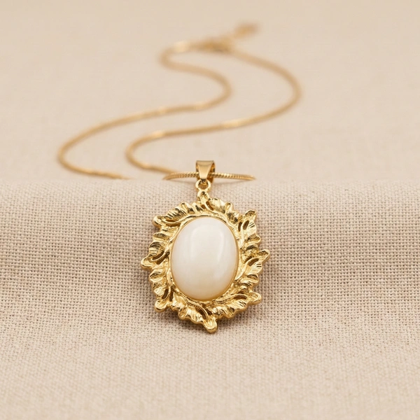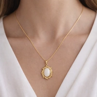 Capture timeless elegance with this vintage-inspired pendant, featuring a smooth, oval moonstone cradled in an intricately sculpted gold sunburst frame. Suspended from a delicate curb chain, it’s the perfect statement piece to elevate a simple neckline with a touch of regal sophistication.