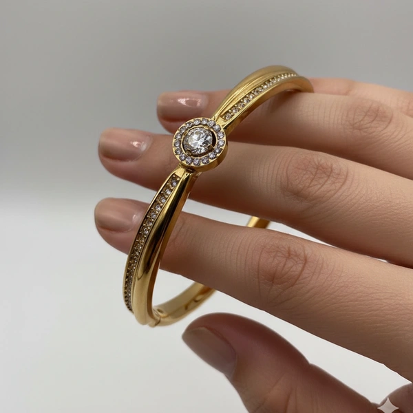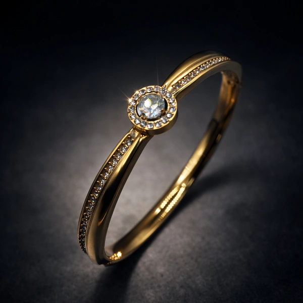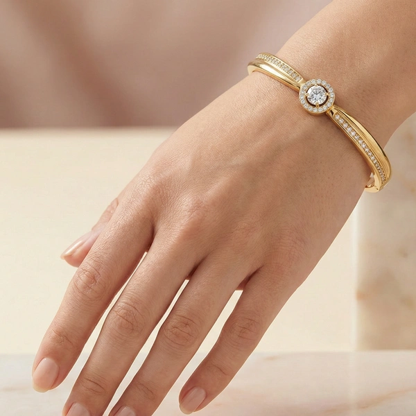 A sleek, tapered gold-tone bracelet featuring a brilliant-cut central solitaire surrounded by a delicate pave halo. Perfect for adding a touch of "quiet luxury" to professional or evening attire.
